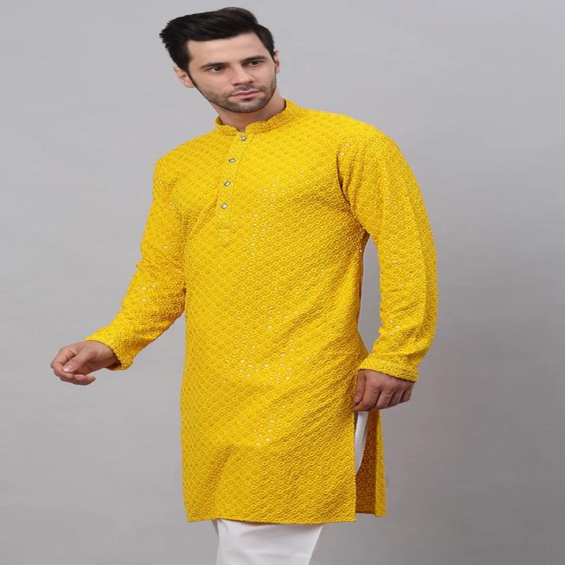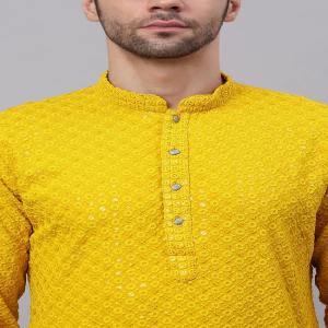 Men Yellow Chikankari Embroidered and Sequence Kurtas